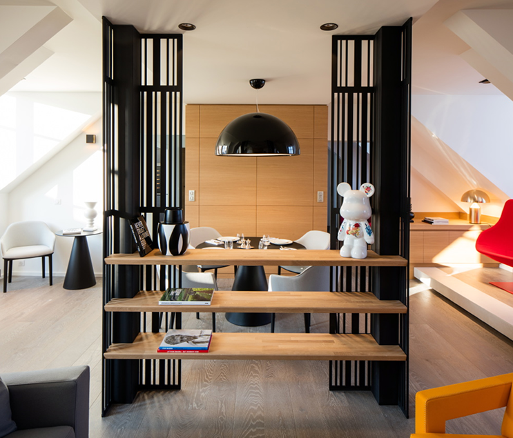 Plus vastes et baignées de clarté, nos suites révèlent un espace salon où l’on s’installe pour lire, travailler ou simplement contempler le clocher voisin. Les détails artisanaux — tapis faits main, luminaires aux lignes épurées — ajoutent une note chaleureuse.